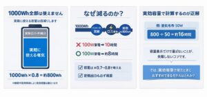使用時間(h)=バッテリー容量*90%(放電深度)/お使いの機器の消費電力(ワット数)